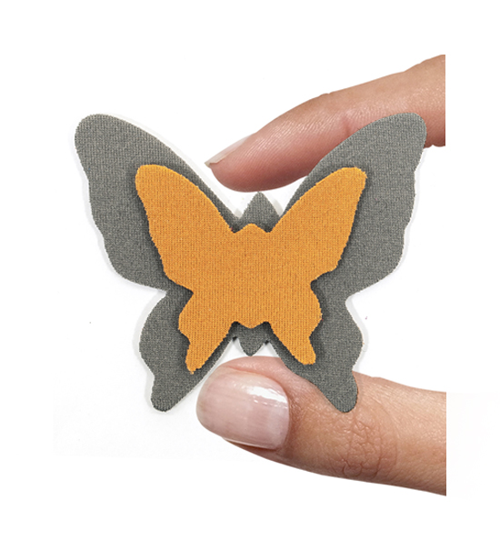 Sagoma in neoprene a forma di farfalla di 75×60 mm circa, spessa 3 mm di colore arancio (primo lato) e grigio (secondo lato). Le caratteristiche principali di questo materiale sono la elasticità, la resistenza al taglio, allo schiacciamento ed all’invecchiamento atmosferico al calore. Articolo confezionato e venduto in bustine da un pezzo (2 sagome per pezzo) e/o multipli.
