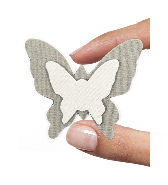 Sagoma in neoprene a forma di farfalla di 75×60 mm circa, spessa 3 mm di colore avorio (primo lato) e noce (secondo lato). Le caratteristiche principali di questo materiale sono la elasticità, la resistenza al taglio, allo schiacciamento ed all’invecchiamento atmosferico al calore. Articolo confezionato e venduto in bustine da un pezzo (2 sagome per pezzo) e/o multipli.