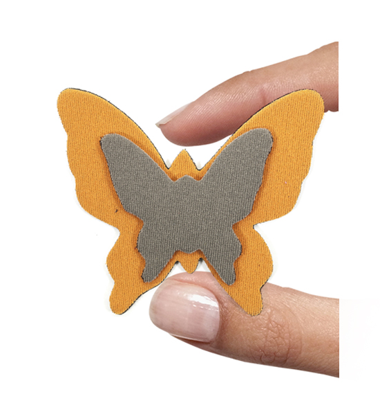 Sagoma in neoprene a forma di farfalla di 75×60 mm circa, spessa 3 mm di colore grigio (primo lato) e arancio (secondo lato). Le caratteristiche principali di questo materiale sono la elasticità, la resistenza al taglio, allo schiacciamento ed all’invecchiamento atmosferico al calore. Articolo confezionato e venduto in bustine da un pezzo (2 sagome per pezzo) e/o multipli.