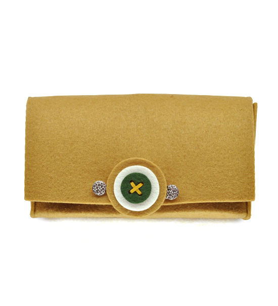 Kit fai-da-te “Creative kit” per realizzare pochette in feltro di colore noce, busta contente: sagoma di feltro base, bottoni magnetici, matassina di filo, applicazioni varie e istruzioni pratiche.