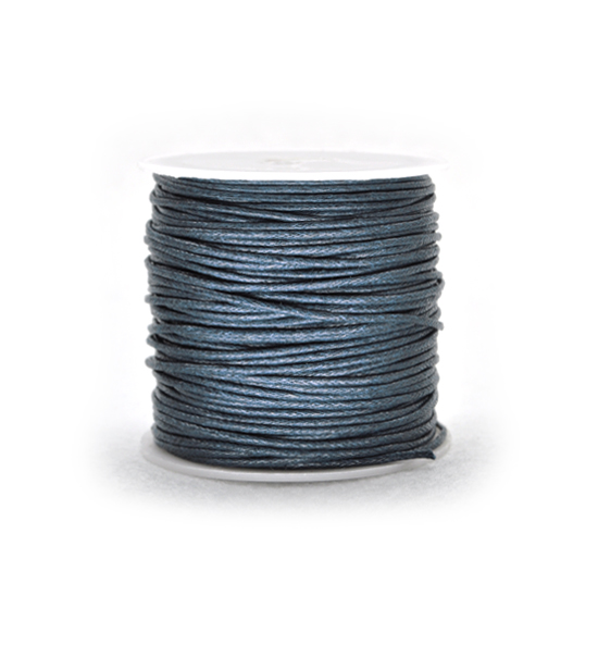 Cordoncino in cotone cerato (100% naturale), confezionato in bobine da 25 metri dello spessore di 1 mm circa, di colore blu petrolio, disponibile anche in altri colori sulla sezione “prodotti > cordini > cordini in cotone cerato” del sito.