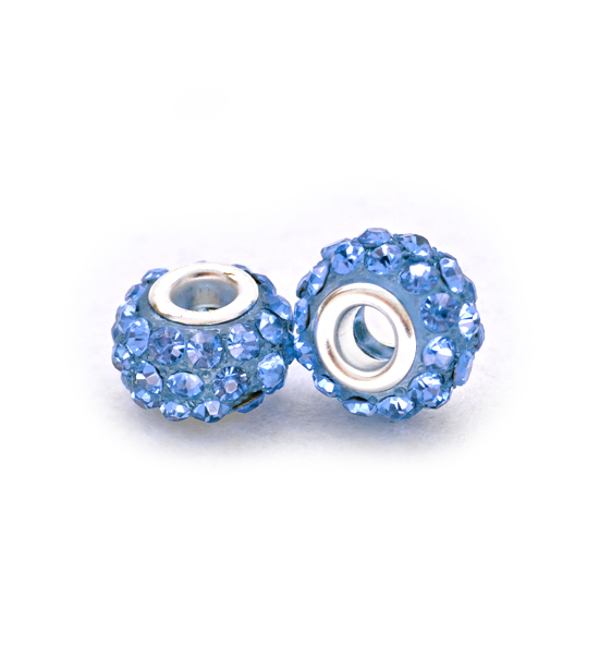 Perla sferica in materiale acrilico con dimensioni di 10×12 mm, decorata con 3 file di strass per un totale di 36 pezzi. Foro centrale di 5 mm circa e terminali in metallo.