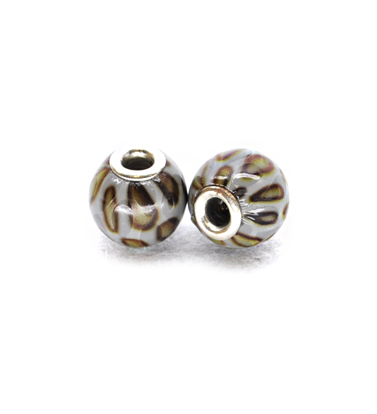 Perla sferica di diametro 14 mm, dalla superficie maculata semilucida rivestita in ecopelle di colore grigio. Con foro centrale di circa 4 mm e terminali in metallo.