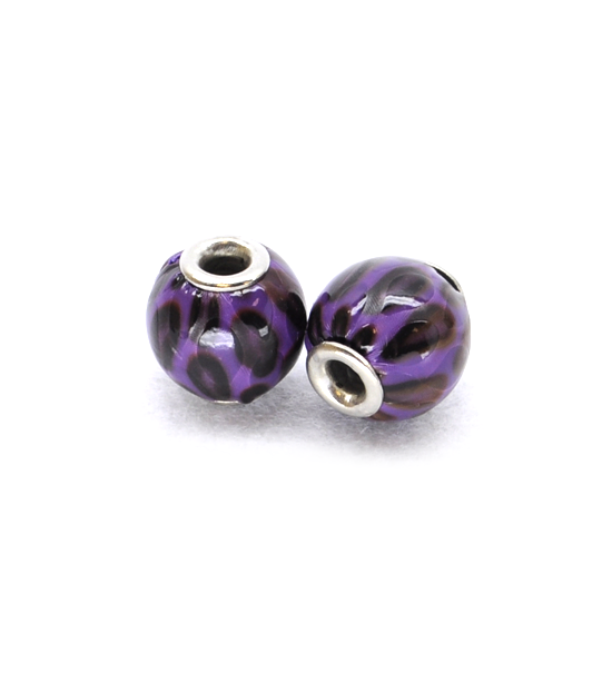 Perla sferica di diametro 14 mm, dalla superficie maculata semilucida rivestita in ecopelle di colore viola. Con foro centrale di circa 4 mm e terminali in metallo.